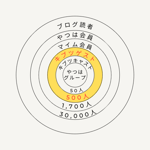 その内側に”やつは会員(またはメルマガ登録者)”の方々がおよそ3万人ほどいて、主にやつはショップで商品を購入したり、サービスをご利用されているお客様となります。